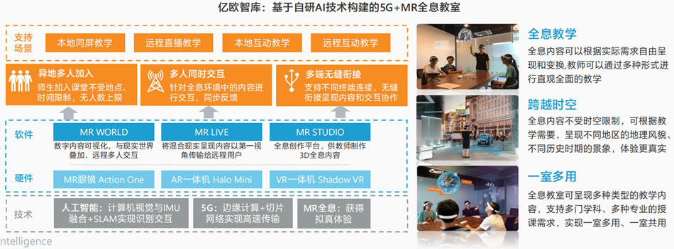 專注于混合現(xiàn)實(shí)(MR)L域的影創(chuàng)科技,以融合人工智能技術(shù)的MR混合現(xiàn)實(shí)眼鏡為核心,構(gòu)建了“5G+MR”全息教室的解決方案。該系統(tǒng)在教