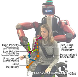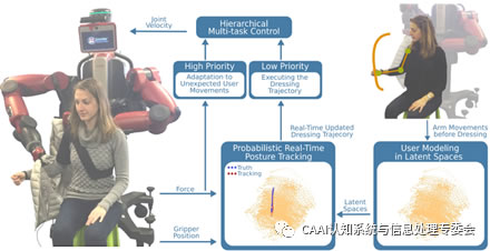 機器人可以為殘疾人或老年人的日常生活提供J大幫助,比如說機器人輔助穿衣。然而穿衣過程中,用戶上肢的突然動作可能導致穿衣任務(wù)的失敗,甚至為用戶帶來危險。使用視覺傳感器實時追蹤用戶上肢運動(user posture tracking)非常困難,因為衣服和機器人都對用戶造成了遮擋。例如,使用開源骨骼追蹤框架(OpenNI Skeleton Tracker [1])和深度學習方法OpenPose [2],均無法實施準確的追蹤用戶上肢運動。