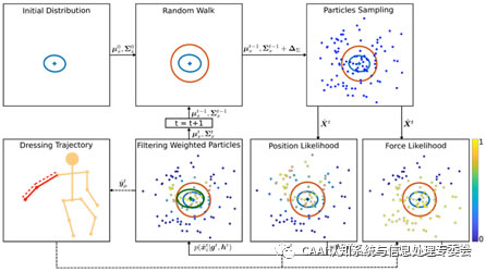 如圖2所示,我們要求健康用戶穿著繃帶來模擬上肢殘疾情況。我們將采集用戶上肢隨機運動的數(shù)據(jù),將其映射至二維隱變量空間中建立個性化用戶模型。在該二維空間中,我們采用基于概率的粒子濾波方法(particle filter),完成多傳感器信息融合(機器人與用戶間力的信息,機器人末端執(zhí)行器位置信息),從而實現(xiàn)用戶上肢運動的實時準確追蹤。在我們之前的研究中 [3], 我們將機器人穿衣動作描述為兩個層級任務(wù):G層級任務(wù)即機器人根據(jù)力的信息調(diào)整運動軌跡,從而實時減小用戶的受力情況,確保用戶的舒適與安全;低層級任務(wù)即通過PD控制完成從瘦-肘-肩關(guān)鍵的穿衣軌跡,該軌跡由本文的用戶上肢追蹤方法實時更新。