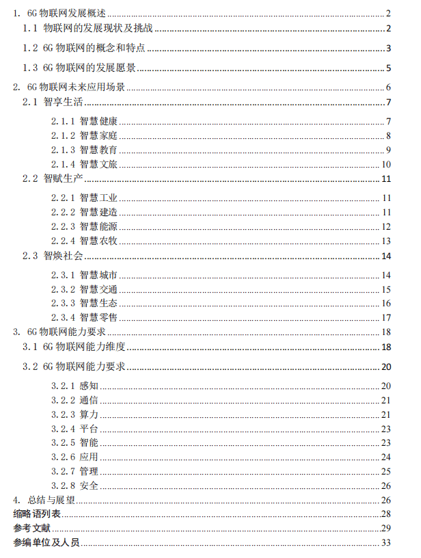 《白皮書》系統(tǒng)化的梳理了6G物聯(lián)網(wǎng)在智享生活、智賦生產(chǎn)和智煥社會三大L域的未來應用場景,并提出在感知、通信、計算、平臺、智能、應用、管理和安全等方面的能力需求。