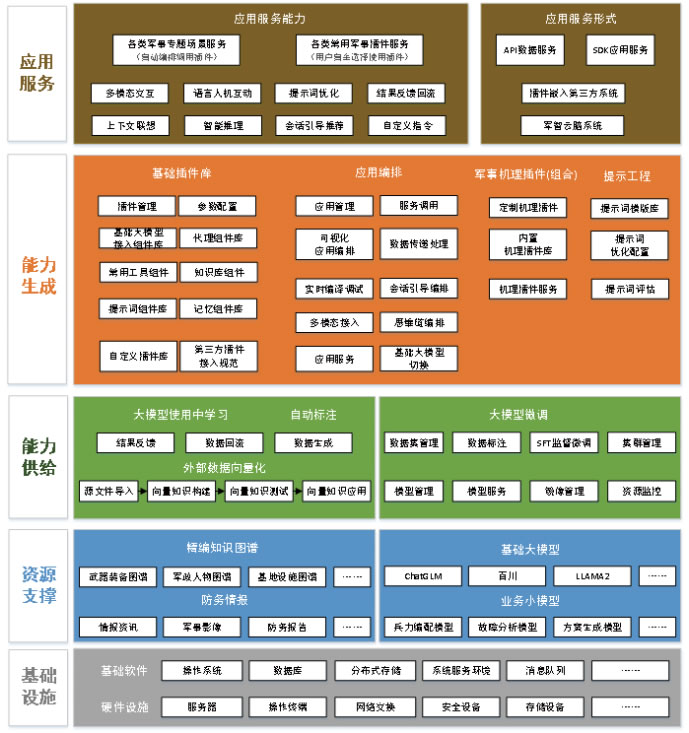 2.技術(shù)架構(gòu):基于大模型的云平臺(tái)智能運(yùn)維系統(tǒng)從下至上,分為基礎(chǔ)設(shè)施層、資源支撐層、能力供給層、能力生成層和應(yīng)用服務(wù)層。