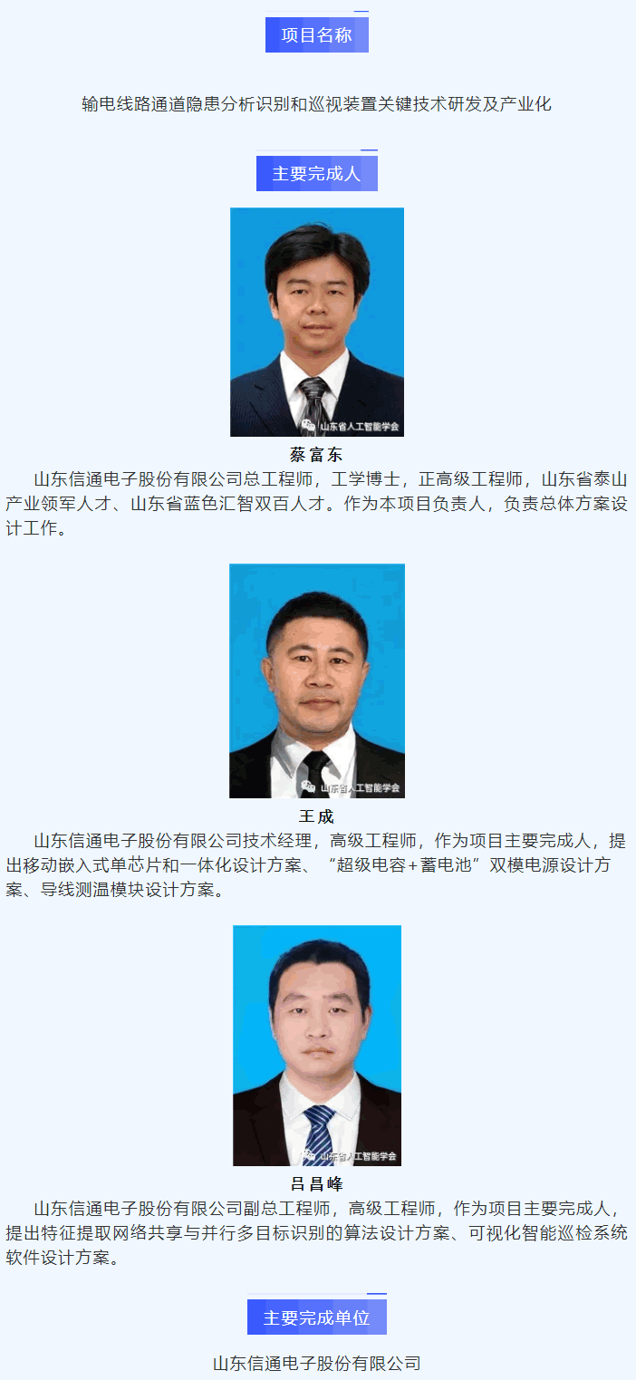 本項(xiàng)目屬于人工智能L域,在山東省重大科技專項(xiàng)、企業(yè)自主項(xiàng)目的支持下,經(jīng)過5年持續(xù)努力,引入人工智能技術(shù)解決了以上行業(yè)難題,取得了系列成果:(1)首次提出了基于人工智能圖像識別技術(shù)的輸電線路隱患圖像分析方法,解決了人工識別工作量大、效率低的難題;(2)首次突破了在線監(jiān)測裝置及系統(tǒng)規(guī);瘧(yīng)用的主要技術(shù)障礙;(3)首次提出了評價(jià)處置到位程度的定量計(jì)算方法,開發(fā)了告警接收、處置安排及消警反饋的移動智能巡檢終端及其APP應(yīng)用,融合人工智能、移動應(yīng)用的可視化遠(yuǎn)程巡檢系統(tǒng),實(shí)現(xiàn)隱患實(shí)時(shí)監(jiān)測、智能分析、預(yù)警推送和快速處置的全流程閉環(huán)。