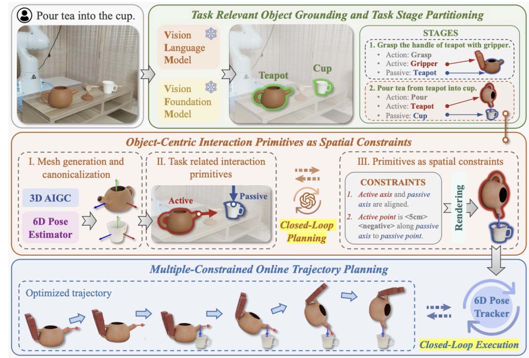 以物體為中⼼的交互基元作為空間約束:通過(guò) 3D 基座模型⽣成任務(wù)相關(guān)物體的 3D 模型和規(guī)范化空間(canonical space),使 VLM 能夠直接在該空間中采樣 3D 交互基元,作為 Action 的空間約束,從⽽優(yōu)化求解出 Active 物體在 Passive 物體規(guī)范坐標(biāo)系下的⽬標(biāo)交互姿態(tài)。