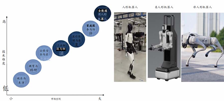 國(guó)內(nèi)機(jī)器人大多瞄準(zhǔn)三類下游進(jìn)行布局,產(chǎn)品形態(tài)由非人形到類人形逐步拓展至雙足人形。人形機(jī)器人可