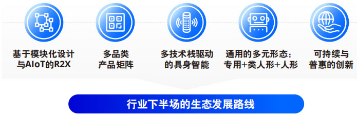 開放性的全棧式智能服務(wù)機(jī)器人生態(tài)的發(fā)展 路線是一個(gè)多維度、跨領(lǐng)域的綜合性戰(zhàn)略, 進(jìn)入行業(yè)下半場 ,服務(wù)機(jī)器人正沿著一條創(chuàng) 新的發(fā)展道路前進(jìn) 。這條道路的實(shí)現(xiàn)需要依 靠多種戰(zhàn)略的發(fā)展 ,其中包括了以模塊化設(shè) 計(jì)和AIoT技術(shù)為基礎(chǔ) ,構(gòu)建起R2X (Robot-to- Everything),即機(jī)器人與萬物互聯(lián),使得機(jī)器 人能夠靈活地與周圍環(huán)境和設(shè)備進(jìn)行交互。在 這一生態(tài)中 ,專用、類人形和人形機(jī)器人三種 形態(tài)相輔相成 ,不可替代 ,共同構(gòu)成了機(jī)器人 行業(yè)的未來生態(tài) ,以適應(yīng)各種場景和任務(wù)。而 這背后 ,是多技術(shù)棧的驅(qū)動(dòng)力 ,它們集成了自 主移動(dòng)、操作和交互等關(guān)鍵技術(shù) ,賦予機(jī)器人