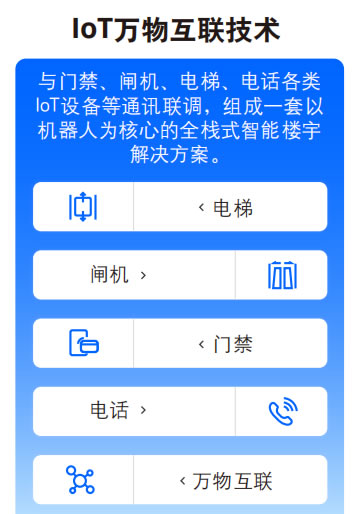 AIoT技術的核心在于通過物聯(lián)網(wǎng)技術支持服務機器人與各類設備(如電梯、 門禁系統(tǒng)、 電話系統(tǒng)等)建立實時連接 ,從而使機器人從孤立 的操作單元轉(zhuǎn)變?yōu)槎嗝婊ヂ?lián)的智能生態(tài)中的一 環(huán)。例如 ,在智能樓宇中 ,服務機器人可以通 過IoT技術與電梯系統(tǒng)聯(lián)動,實現(xiàn)自主乘梯,為 用戶帶來全棧式的智能服務體驗。