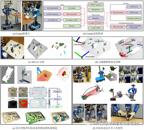 Cosero[1]是德國波恩大學的Sven Behnke團隊根據(jù)家庭環(huán)境中的日常操作任務而研制的一款仿人操作機器人(如圖1(a)(b))。機器人底部配備了四輪獨立轉向行走機構,以便在靈活的通過狹窄通道,上部配備了兩個7自由度機械臂已完成擬人的操作,并在夾持器末端裝有紅外測距傳感器已達到對抓取目標的距離探測,在D端安裝有Kinect相機,以實現(xiàn)對目標環(huán)境的3D感知。Cosero通過底盤的激光雷達進行導航和定位,采用法線估計和場景分割相結合的方法對目標進行3D點云分割,采用無碰撞抓取方法[1]對目標物體進行抓取(如圖1(c)(d))。在論文[2]中,作者運用Cosero進行零件分揀搬運實驗,通過2D激光雷達導航到作業(yè)點,通過RGB-D相機對目標進行識別分割,規(guī)劃抓取路徑和抓取姿態(tài)估計(如圖1(e))。在論文[3]中,作者采用深度學習方法對目標進行姿態(tài)估計,并完成了提壺灌溉,人機交互和使用工具等復雜任務(如圖1(f))。Schwarz[4]介紹了Cosero基于深度學習方法的目標姿態(tài)估計和RGB-D SLAM等感知測量。