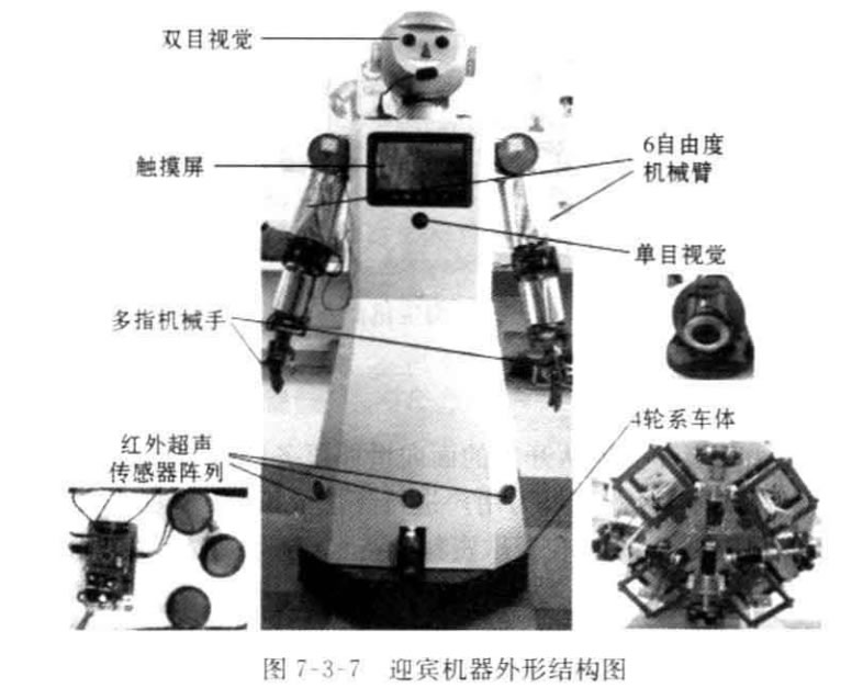 迎賓機(jī)器人采用造型活潑的卡通形象,其外形如圖7-3-7所示,頭部有雙目視覺傳感器,身體部分主要包括觸摸屏、機(jī)械臂和機(jī)械手。身高約1.4~1.5m, 采 用 輪式移動方式,Z高移動速度約18m/min 。 可自主完成接待、導(dǎo)引、語音提示、點(diǎn) 菜等服務(wù)工作。連續(xù)工作時間不小于2小時。主要參數(shù)如下: