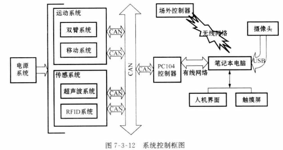 迎賓服務(wù)機(jī)器人系統(tǒng)各硬件模塊主要由CAN 總線連接,通過統(tǒng)一的CAN 總 線協(xié)議將各模塊簡單地加載到系統(tǒng)中。系統(tǒng)主要由電源系統(tǒng)、運(yùn)動(dòng)控制系統(tǒng)、傳感 系統(tǒng)等組成,其中運(yùn)動(dòng)控制系統(tǒng)包括雙臂系統(tǒng)及移動(dòng)系統(tǒng),傳感器系統(tǒng)包括超聲波系統(tǒng)、RFID定位系統(tǒng)、視覺系統(tǒng)組成。