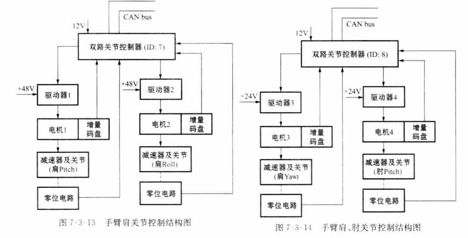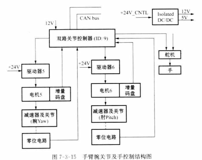 手臂各關(guān)節(jié)控制電路采用分布式控制系統(tǒng),各關(guān)節(jié)控制器(主 MCU 是 TMS320LF2407)由CAN 總線相連(CAN2.0-A 版本)?刂浦芷跒5m (即上位機(jī) 與 所 有 關(guān) 節(jié) 控 制 器 通 信 一 遍 , 再 加 一 定 裕 度 后 的 時(shí) 間 ) 。 各 關(guān) 節(jié) 控 制 電 路 結(jié) 構(gòu) 如 圖7 - 3 - 13、圖7 - 3 - 14及圖7 - 3 - 15所示。