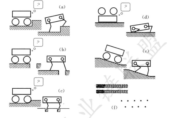 腿式移動機器人特別適合于粗糙地形,在這種地形上,它們能夠橫越輪式系統(tǒng) 不能通過的障礙,如(a) 臺階,(b) 裂隙,或(c) 沙斑。另外,當(dāng)機器人跌倒時,高 數(shù)目的自由度容許機器人站起來(d) 并保持負(fù)重平衡(e)。由于腿式系統(tǒng)不需 要支撐的連續(xù)路經(jīng),它們可以依靠少數(shù)幾個所選的立腳點,從而減少對環(huán)境的 影響(f) 。