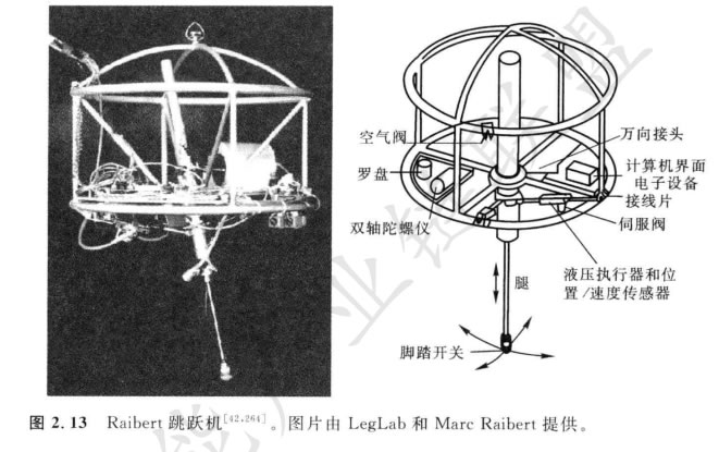 圖2.13表示的是Raibert 跳躍機42,2647,它是已制作的Z有名的單腿跳躍機器人 之一。這個機器人通過調(diào)節(jié)相對于身體的腿角,不斷地修正身體姿態(tài)和機器人速度。 激勵是液壓的,包括在立姿向空中跳躍期間腿的高性能縱向伸展。激勵雖然是強有 力的,但這些激勵器需要一個隨時連接到機器人的大型的、外裝的液壓泵。