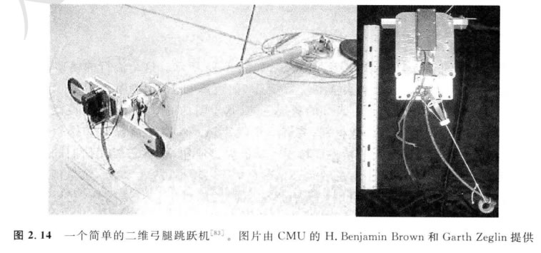 圖2.14表示的是Z近研制開發(fā)的更高效能的結構[83,它利用了設計良好的機械 動力學83。它不用外裝的液壓泵供給能量,而是設計了弓腿跳躍機,當它著地時,利 用一根有效的弓形彈簧腿來獲得機器人的動能。這個彈簧返回了幾乎85%的能量, 這就意味著每次只需要添加所需能量的15%即可穩(wěn)定跳躍。這個機器人用支架沿軸 受到約束,用裝在機器人上的一組電池,已經(jīng)展示能連續(xù)跳躍20 min 。和 Raibert 跳 躍機一樣,弓腿跳躍機通過在髖關節(jié)改變相對于身體的腿角來控制速度。