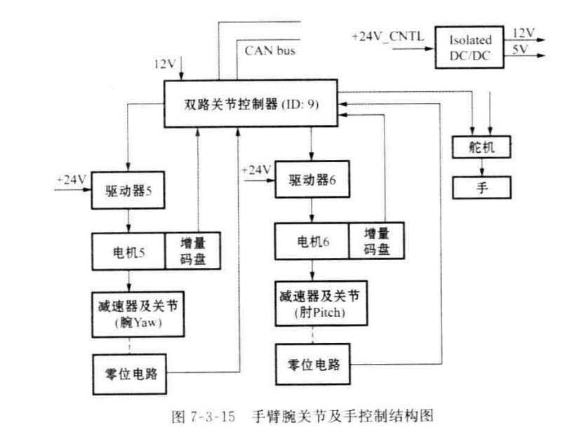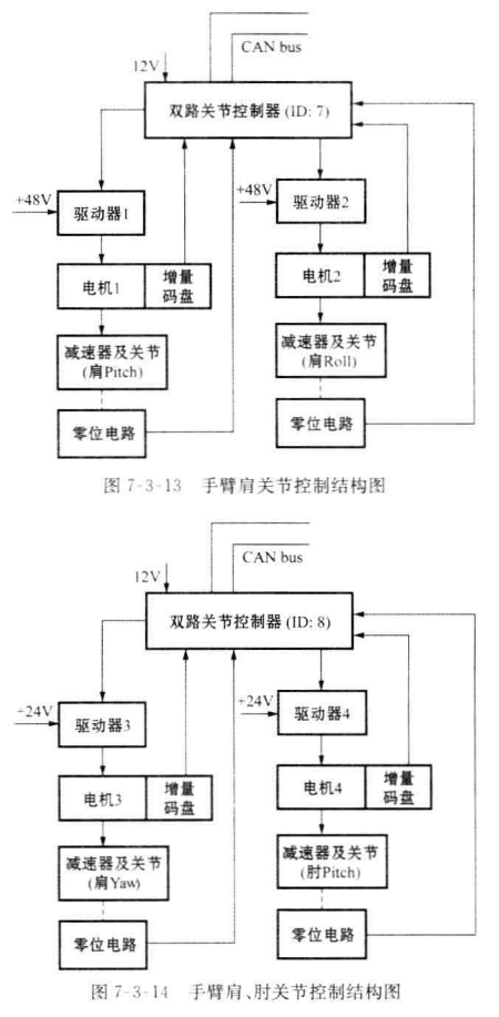 手臂各關(guān)節(jié)控制電路采用分布式控制系統(tǒng),各關(guān)節(jié)控制器(主 MCU 是 TMS320LF2407)由CAN 總線相連(CAN2.0-A 版本)?刂浦芷跒5m (即上位機(jī) 與 所 有 關(guān) 節(jié) 控 制 器 通 信 一 遍 , 再 加 一 定 裕 度 后 的 時(shí) 間 ) 。 各 關(guān) 節(jié) 控 制 電 路 結(jié) 構(gòu) 如