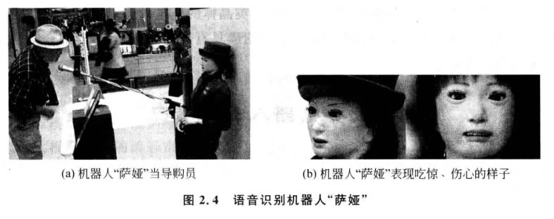 日本著名的東京高島屋商場為了解決顧客排長隊購物難的問題,引入了一款語音識 別機器人“薩婭”當導(dǎo)購員,如圖2.4所示!八_婭”能夠用超過700種不同的語音方式對 購物者的問題和投訴做出反應(yīng),它會告訴顧客去哪層樓能夠買到他們所需的商品,還能 和他們閑聊幾句,但是有時也會無法“溝通”。曾有一位記者問“薩婭”問題,可能是因為 他口音太重,“薩婭”聽不懂,一直指著洗手間的方向,無法告訴記者所要去的商場樓層。 雖然“薩婭”的面部動作還存在一些不足,但是它表現(xiàn)高興、傷心或生氣時是很逼真的。 盡管“薩婭”是一個語音識別服務(wù)機器人,但是它像其他日本人那樣講禮貌,彬彬有禮。