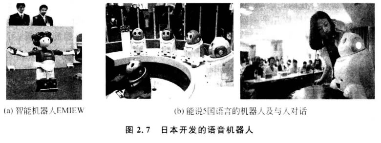 日本日立公司也研制了一臺智能機器人EMIEW, 它的個頭和小孩一樣,依靠輪子移 動,如圖2.7(a)所示。由于身上裝有數(shù)碼相機和雷達探測器,它可以自動地躲避障礙物。 同時它的詞匯儲備量達到100多個,能夠對一些簡單的聲音指令做出反應,并且還能夠 和人進行簡單的對話交流,甚至播報天氣預報等。第二代 EMIEW2 機器人可以通過無 線電裝置接收指令,然后毫不費力地在辦公室之間來回奔波,為辦公室人員跑腿。它站 立時身高大約為31.5英寸,體重為29磅。它能夠對障礙物應付自如,對人的語音做出 回應,并且一次充電后即可工作1小時。此外,能說5國語言的機器人及與人對話的機 器人也已經誕生了,如圖2.7(b) 所示。在我國舉辦的日語演講大賽現(xiàn)場上,參加比賽的 選手以及日語院校的學生不但與該機器人進行了交流互動,而且該機器人還獻上了許多 精彩舞蹈和歌曲。