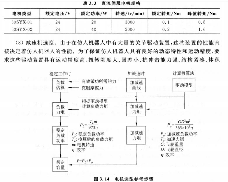 電機是將電能轉化為機械能的部件,由此發(fā)生的力經(jīng)過以減速器為核心的動力傳遞 系統(tǒng)到達負載端。在此過程中, 一部分力克服摩擦,以熱能的形式耗散出去,因此傳動效 率無法達到100%。在實際設計中,應該將上述路線的順序倒過來,即以負載的大小和摩 擦系數(shù)及運動效率去推算電機的容量。施加于電機的負載大致可以劃分成三種基本類 型:有效力、無效力、慣性力。智能交互機器人的驅動器大致有直流電機、步進電機、舵機。如 圖3.14所示為電機選擇的方法和步驟。從圖中可知,決定電機容量時,涉及負載估算、 驅動對象運動規(guī)律確定、傳動系統(tǒng)轉動慣量折算等內(nèi)容[96]。