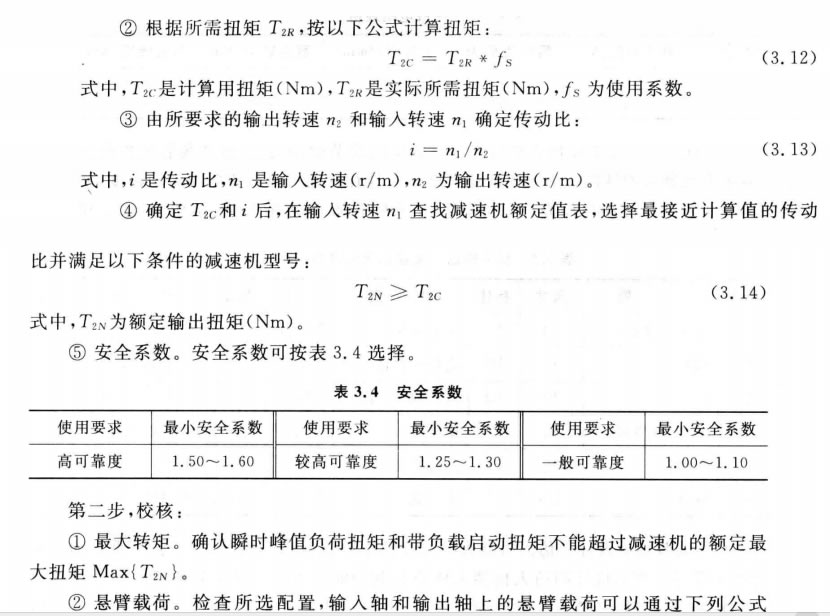 (4)精密行星減速機選型及其問題。選用精密行星減速機應考慮其結構類型、安裝 形式、承載能力、輸出轉速、工作條件等因素。減速機的承載能力是在額定轉速下,每天 工作10小時和啟動數(shù)少于10time/h 及平穩(wěn)無沖擊的條件下得出的,所以應按以下步驟 進行選型[97]。