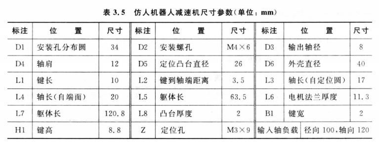 (2)直流伺服電機選型。根據(jù)上面的分析,為本節(jié)設計的智能交互機器人選用了兩種 類型的直流伺服電機,分別是上海瑞克科技發(fā)展有限公司的50SYXB-01 和 5 0SYXB- 02,質(zhì)量大約為0.5~1.0kg, 規(guī)格如表3.3所示。從表中不難看出這種直流伺服電機 轉速非常高,Z高可達到3000r/min(轉/分鐘);而其轉矩又很小,不能直接用于關節(jié)驅 動裝置。