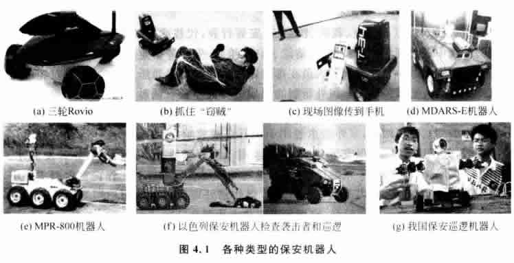 美國Z新開發(fā)的保安機器人 Rovio 可以幫助經常外出又不放心家中物品的人。 Rovio 采用三輪和GPS 系統(tǒng),用戶可以設定幾個點,它就會在家中來回地巡邏,如圖4.1(a) 所示。Rovio 裝有攝像頭和麥克風用于探查房屋內的情況,除此之外,它還安裝有 LED 燈,以便夜晚能更清晰地看清周圍環(huán)境。由于攝像頭安裝在可伸縮的機械手上,所以屋 主可以控制攝像頭從前后左右不同的角度進行觀察。 Rovio 通過 WiFi 聯(lián)網,屋主使用手 機或者計算機即可遠程遙控。日本一家公司Z近開發(fā)了一款保安機器人,它裝有新型傳 感器,可以自動地發(fā)射網狀物將竊賊套住,并將現(xiàn)場的圖像發(fā)到主人的手機上,如 圖4 . 1(b) 和圖4. 1(c) 所示。在美國新澤西州的一家公司里, 一臺SR2 型室內保安機器 人每天都會在公司大樓內狹窄的過道中巡邏。它是一臺小車式機器人,只要發(fā)現(xiàn)有煙霧 或距其30m 以內有行人,它就會向指揮中心的值班人員發(fā)出警報。 SR2 型室內保安機器 人是Cybermotion 公司為滿足美軍后勤部門的迫切需求而研制的。其改進型是 MDARS-I 機器人,MDARS-I 的Z低速度為3km/h, 一次充電后可連續(xù)地工作8小時,它 可以在360°的范圍內發(fā)現(xiàn)10m 遠的物體。該機器人裝有入侵者探測用微波雷達、熱成像 儀、音響傳感器、攝像機、紅外照明器、旋轉及傾斜平臺,它還有超聲波傳感器、導航傳感 器、無線局域網絡轉接器等。當工作人員下班后,該機器人仍然可以在倉庫內巡邏。此 外,它還可以確定所存物品的狀況及位置,發(fā)現(xiàn)問題及時發(fā)出警報。