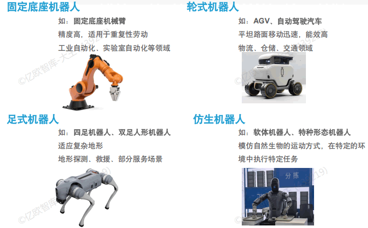 具身智能的物理載體形態(tài)豐富多樣,可以將其劃分為幾大類別:固定底座機器人、