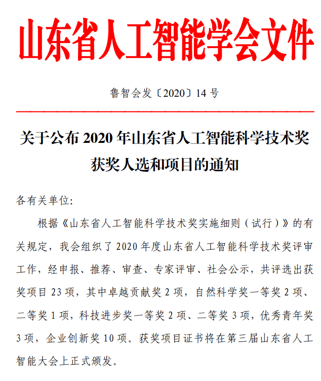 根據(jù)《山東省人工智能科學(xué)技術(shù)獎實施細(xì)則(試行)》的有關(guān)規(guī)定,我會組織了2020年度山東省人工智能科學(xué)技術(shù)獎評審工作,經(jīng)申報、推薦、審查、專家評審、社會公示,共評選出獲獎項目23項,其中出色貢獻(xiàn)獎2項,自然科學(xué)獎一等獎2項、二等獎1項,科技進(jìn)步獎一等獎2項、二等獎3項,優(yōu)秀青年獎3項,企業(yè)創(chuàng)新獎10項。獲獎項目證書將在第三屆山東省人工智能大會上正式頒發(fā)。