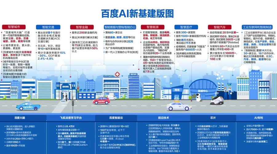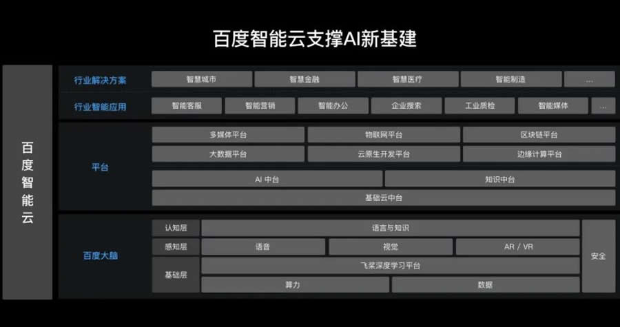 6月11日,百度發(fā)布AI新基建版圖,目標(biāo)成為中國(guó)新基建AI服務(wù)大提供商。依托百度大腦、飛槳深度學(xué)習(xí)平臺(tái)、百度智能云、芯片、量脈、超級(jí)鏈等在內(nèi)的新型AI基礎(chǔ)設(shè)施,百度在智慧城市、智能交通、智慧金融、智能客服與營(yíng)銷(xiāo)、智慧能源、智慧醫(yī)療、智能汽車(chē)、工業(yè)互聯(lián)網(wǎng)和智能制造等八大L域推動(dòng)產(chǎn)業(yè)智能化升級(jí)。