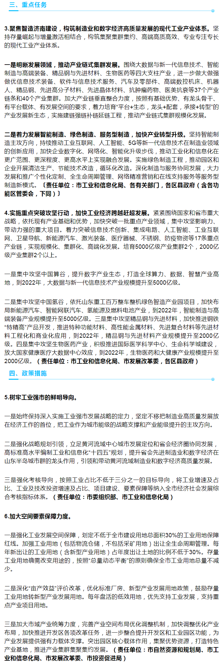 1.總體要求。堅持以新時代中國特色社會主義思想為指導,認真貫徹落實總書記對山東、對濟南工作的重要指示要求,對標對表“走在前列、多面開創(chuàng)”目標定位,按照省委省政府打造“智造濟南”工作要求,堅持新發(fā)展理念,把推動制造業(yè)G質(zhì)量發(fā)展放在經(jīng)濟工作首位,大力實施工業(yè)強市發(fā)展戰(zhàn)略,以智能制造為主攻方向,深化新一代信息技術與制造業(yè)融合發(fā)展,加快工業(yè)互聯(lián)網(wǎng)創(chuàng)新發(fā)展,加快制造業(yè)生產(chǎn)方式和企業(yè)形態(tài)根本性變革,加快構建現(xiàn)代產(chǎn)業(yè)體系。聚力打好產(chǎn)業(yè)基礎G級化、產(chǎn)業(yè)鏈現(xiàn)代化攻堅戰(zhàn),聚焦制造業(yè)優(yōu)化升級、數(shù)字經(jīng)濟引L、服務實體經(jīng)濟三大重點任務,著力培育創(chuàng)新驅(qū)動、項目帶動、政策促動三大動能,凝心聚力、持之以恒打造先進制造業(yè)和數(shù)字經(jīng)濟G質(zhì)量發(fā)展雙引擎,鞏固提升工業(yè)經(jīng)濟的支柱地位和輻射帶動作用,持續(xù)推動產(chǎn)業(yè)和城市能級雙提升,為建設“大強美富通”現(xiàn)代化國際大都市提供強大產(chǎn)業(yè)支撐。