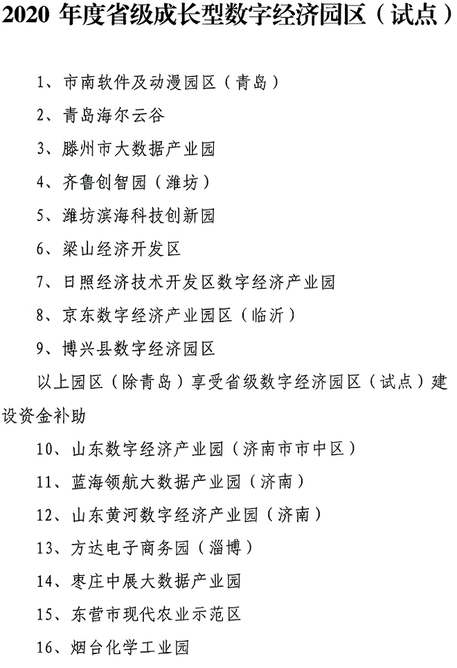 以上園區(qū)(除青島)享受省級(jí)數(shù)字經(jīng)濟(jì)園區(qū)(試點(diǎn))建設(shè)資金補(bǔ)助
