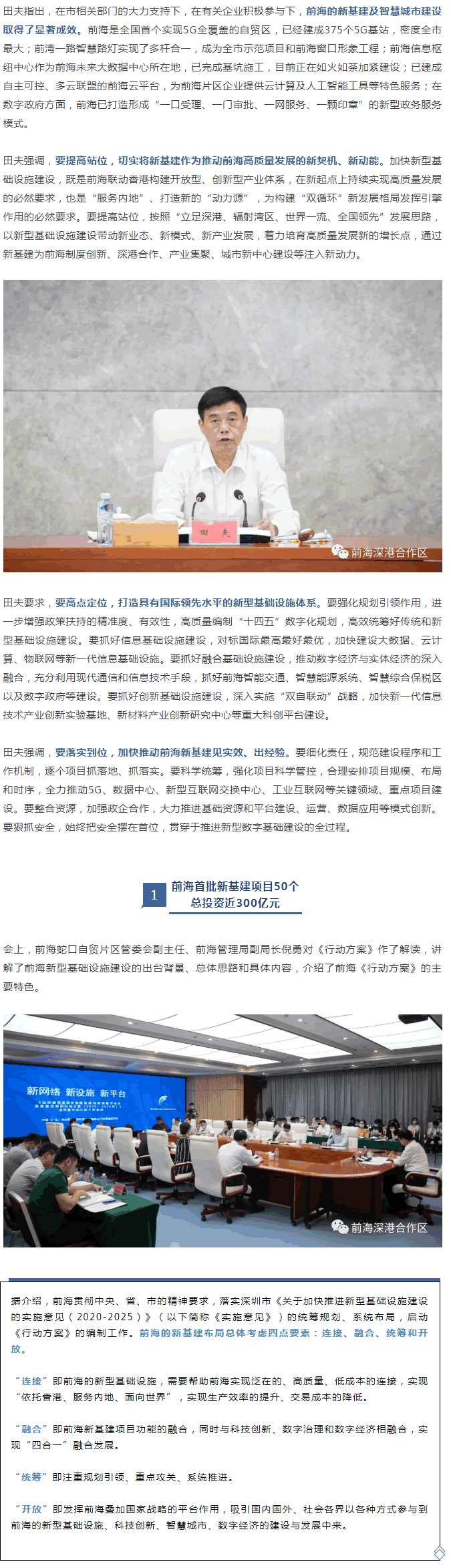 8月6日,前海蛇口自貿(mào)片區(qū)管委會舉行“《加快新型基礎(chǔ)設(shè)施建設(shè)推動前海數(shù)字經(jīng)濟(jì)G質(zhì)量發(fā)展的行動方案(2020-2025年)》發(fā)布暨專項行動工作會議”,正式發(fā)布實施《加快新型基礎(chǔ)設(shè)施建設(shè)推動前海數(shù)字經(jīng)濟(jì)G質(zhì)量發(fā)展的行動方案(2020—2025年)》(下稱《行動方案》)。這是深圳市《關(guān)于加快推進(jìn)新型基礎(chǔ)設(shè)施建設(shè)的實施意見(2020-2025)》出臺之后,全市加快推進(jìn)新基建的行動方案,計劃實施32項新型基礎(chǔ)設(shè)施行動,包括信息基礎(chǔ)設(shè)施建設(shè)9項行動、融合基礎(chǔ)設(shè)施建設(shè)12項行動、創(chuàng)新基礎(chǔ)設(shè)施建設(shè)11項行動,首批重點(diǎn)項目50個、總投資近300億元。