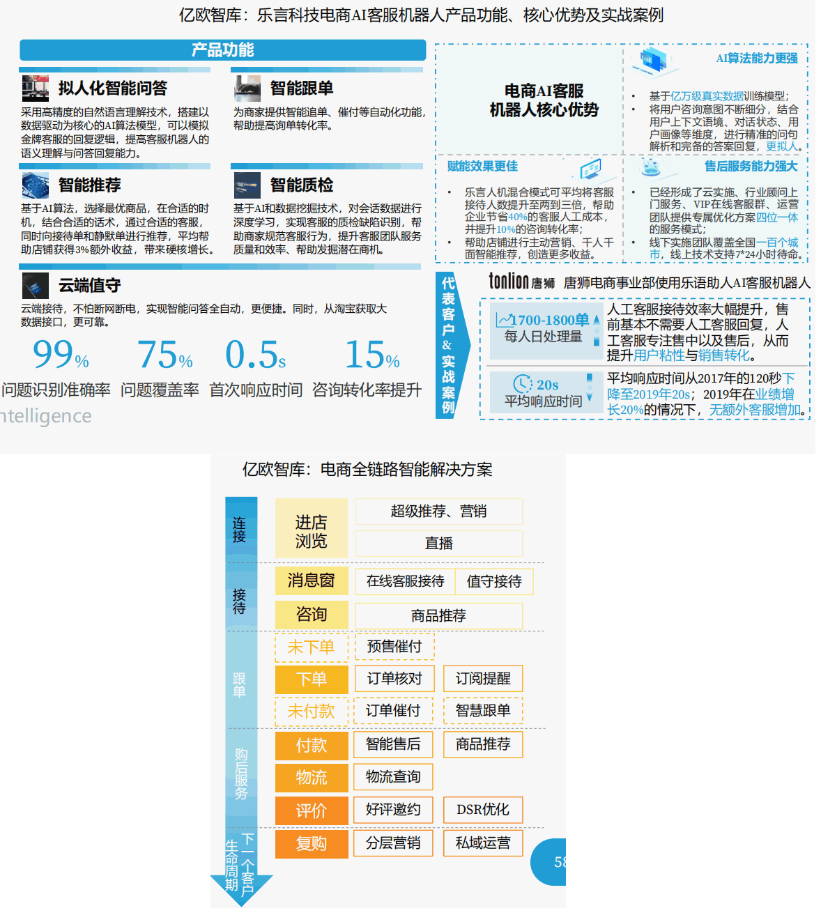 在電商L域,樂(lè)言科技自主研發(fā)了面向淘寶、天貓等平臺(tái)的AI客服機(jī)器人“樂(lè)語(yǔ)助人” ,具備G準(zhǔn)確的語(yǔ)言理解能力,可模擬金牌客 服的回復(fù)邏輯,輔助人工客服進(jìn)行客服咨詢接待、業(yè)務(wù)問(wèn)題處理、智能推薦、客情維系等。AI客服機(jī)器人全年全天24小時(shí)無(wú)休,不僅 降低了人工客服團(tuán)隊(duì)營(yíng)運(yùn)開(kāi)支,還大幅提升了客服人均接待效率與營(yíng)銷轉(zhuǎn)化率,為電商商家創(chuàng)造了更多利潤(rùn)。目前,公司已服務(wù)近3萬(wàn) 家電商頭部客戶,如李子柒、唐獅、江南布衣、如涵、以純、透真、恒安集團(tuán)、達(dá)利園等。