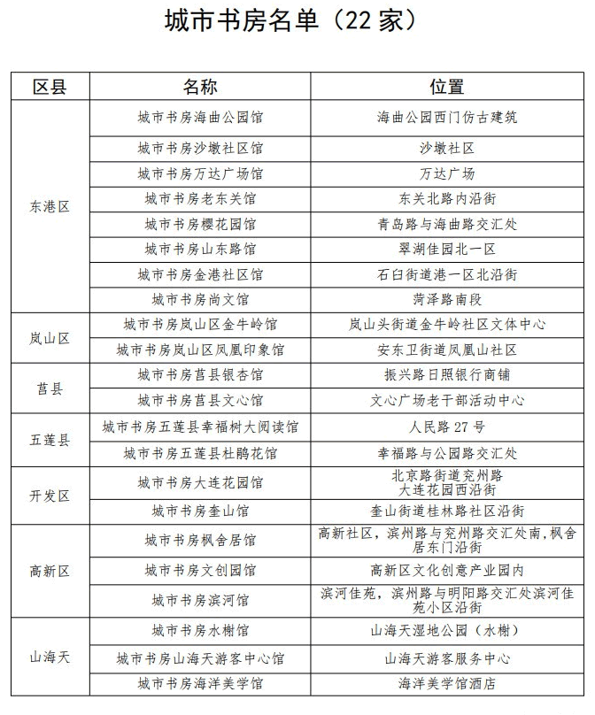 環(huán)衛(wèi)所城市書房(環(huán)翠路南段,興業(yè)新營華府西門) 運(yùn)總集團(tuán)城市書房(黃海二路11號) 石臼街道城市書房(黃海一路與海濱五路交匯處) 開發(fā)區(qū)中心公園城市書房(天津路72號)
