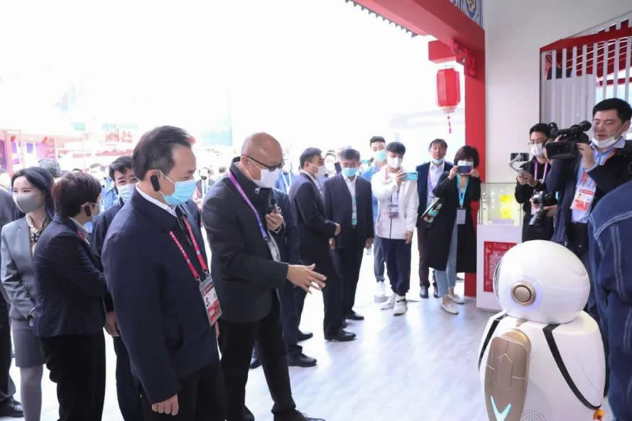 2020年11月5日,山東省委副書記、省長(zhǎng)李干杰等L導(dǎo)在進(jìn)博會(huì)巡展時(shí),智能迎賓講解機(jī)器人“創(chuàng)創(chuàng)”在廣場(chǎng)“至誠(chéng)山東”展區(qū)熱情接待了李干杰省長(zhǎng)一行。