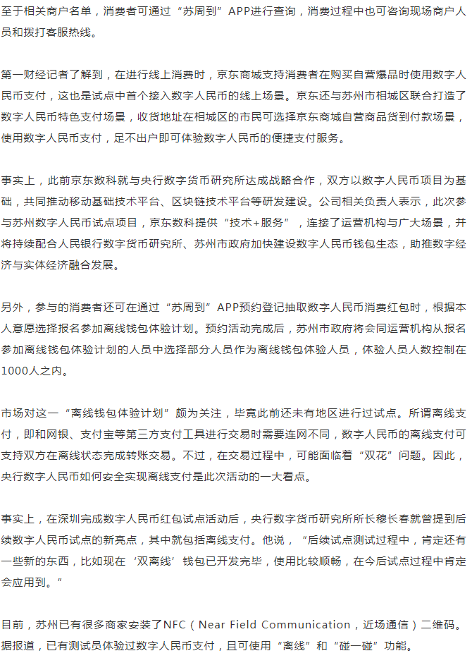 蘇州數(shù)字人民幣消費紅包活動的開展,也反映了我國數(shù)字人民幣的試點工作正穩(wěn)步推進(jìn)。而和此前深圳開展紅包試點不同的是,本次蘇州數(shù)字人民幣紅包活動還支持消費者通過京東商城進(jìn)行線上消費。