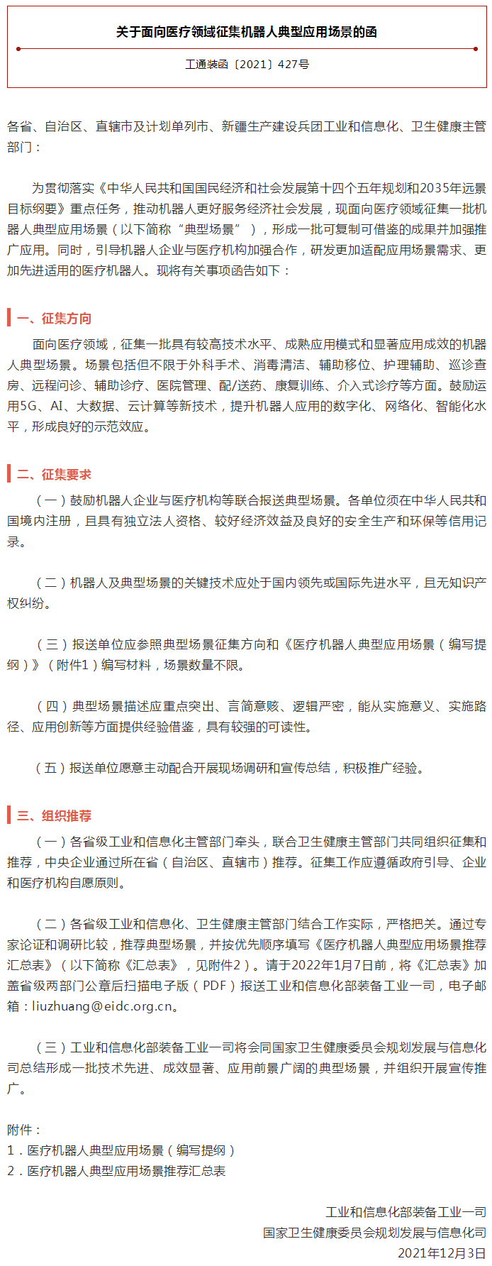 為貫徹落實《中華人民共和國國民經(jīng)濟(jì)和社會發(fā)展第十四個五年規(guī)劃和2035年遠(yuǎn)景目標(biāo)綱要》重點任務(wù),推動機(jī)器人更好服務(wù)經(jīng)濟(jì)社會發(fā)展,現(xiàn)面向醫(yī)療L域征集一批機(jī)器人典型應(yīng)用場景(以下簡稱“典型場景”),形成一批可復(fù)制可借鑒的成果并加強(qiáng)推廣應(yīng)用。同時,引導(dǎo)機(jī)器人企業(yè)與醫(yī)療機(jī)構(gòu)加強(qiáng)合作,研發(fā)更加適配應(yīng)用場景需求、更加先進(jìn)適用的醫(yī)療機(jī)器人。