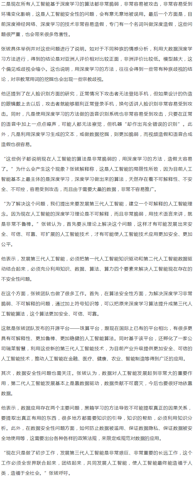 張鈸在演講中指出,現(xiàn)有的人工智能技術常常引起公平性、安全性的問題,具體體現(xiàn)在三個層面。一是利用深度神經(jīng)元網(wǎng)絡來產(chǎn)生一些文本、圖像或是語音時,有時會包含性別、種族、宗教等方面的歧視。