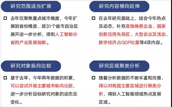 變化及亮點(diǎn)方面,今年AI指數(shù)在研究范圍、研究內(nèi)容、研究對象、研究區(qū)域等維度均進(jìn)行了豐富和完善,包括從僅分析市級維度擴(kuò)展到省級維度、增加國家創(chuàng)新應(yīng)用先導(dǎo)區(qū)等指標(biāo)、增加年度縱向比較和區(qū)域聚類分析等,可以說亮點(diǎn)紛呈。