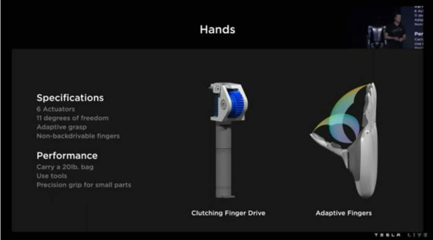 “擎天柱”全身約 50 個自由度,手指靈敏度G,能夠滿足多種規(guī)格的物體抓取需求。機器人單手具有 6 個執(zhí)行器,11 個自由度,在對生拇指與金屬肌腱的配合 下,“擎天柱”能夠完成對不同重量和大小的物件的抓握。同時,特斯拉機械手搭載能夠驅 動手指感知物體的傳感器,幫助其識別需要抓握的物體,并在不斷的抓握過程中學習提G 機械手適應性。