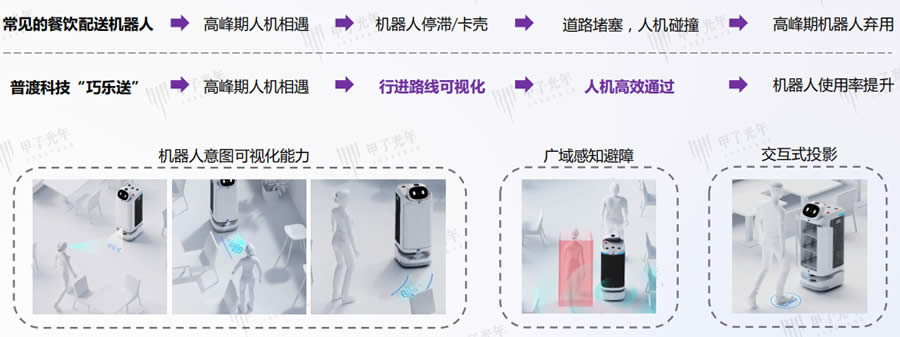 普渡科技創(chuàng)新性地將機器人的行走意圖可視化,建立人機通行的“紅綠燈機制”。