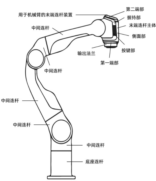 以思靈機器人機械臂產(chǎn)品為例,這是一種用于機械臂的末端連桿裝置,包括末端連桿主體,末端連桿主體設置在機械臂的輸出端;至少一個握持部,握持部能夠被握持,