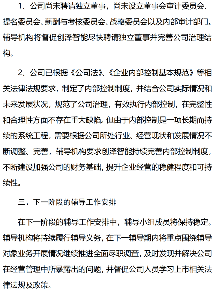 中原證券關(guān)于創(chuàng)澤機(jī)器人上市輔導(dǎo)內(nèi)容,對(duì)公司業(yè)務(wù)開(kāi)展及公司業(yè)績(jī)?cè)斐傻挠绊?督促公司嚴(yán)格按照法律,法規(guī)及規(guī)章制度規(guī)范運(yùn)行,關(guān)注創(chuàng)澤智能歷史沿革生產(chǎn)經(jīng)營(yíng)等情況