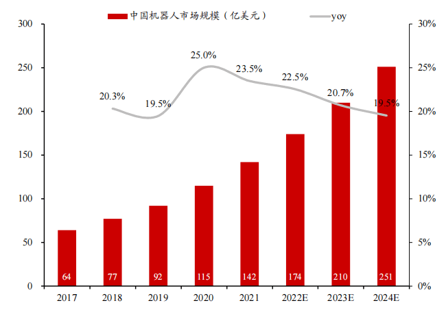 根據(jù)IFR、中國電子學(xué)會數(shù)據(jù),預(yù)計(jì)機(jī)器人市場規(guī)模2024年有望達(dá)到660億美元,2020-2024年CAGR約18%。