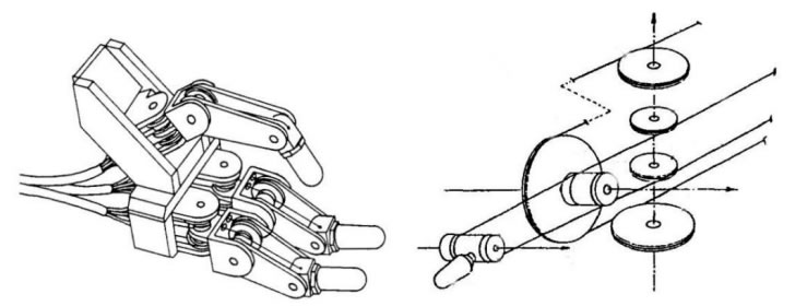 采用旋轉(zhuǎn)型驅(qū)動(dòng)的靈巧手以 Stanford/JPL 手為代表,其驅(qū)動(dòng)系統(tǒng)由直流電機(jī)和齒輪 減速機(jī)構(gòu)組成,因而體積較大,驅(qū)動(dòng)系統(tǒng)只能放在手掌部位,通過腱進(jìn)行手指關(guān)節(jié)的 遠(yuǎn)距離驅(qū)動(dòng)。