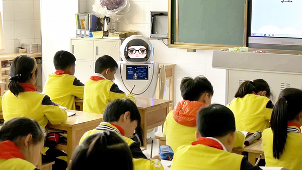 學(xué)校智能教育機(jī)器人正在課堂上與學(xué)生們一起上課。