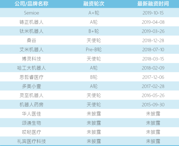 目前,醫(yī)用機(jī)器人具有廣闊的發(fā)展前景,但醫(yī)用L域的門(mén)檻很G,難以落地。因此,專(zhuān)注于醫(yī)療機(jī)器人概念的機(jī)器人公司正面臨融資困難。從上表可以看出,只有Semioe、casting robot和titanium robot三家公司在2019年完成了一輪的融資,其余公司仍然面臨財(cái)務(wù)壓力。