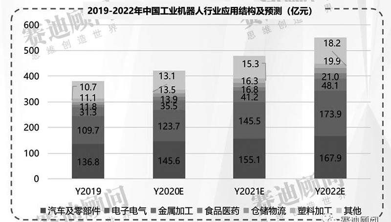 未來三年,工業(yè)機(jī)器人行業(yè)應(yīng)用結(jié)構(gòu)的總體格局基本保持不變。到2022年,汽車及零部件、電子電氣仍然占據(jù)大比重,隨著制造業(yè)轉(zhuǎn)型升級(jí)進(jìn)程的不斷加速,將為金屬加工、食品醫(yī)藥、倉(cāng)儲(chǔ)物流等應(yīng)用行業(yè)帶來更大的市場(chǎng)空間。