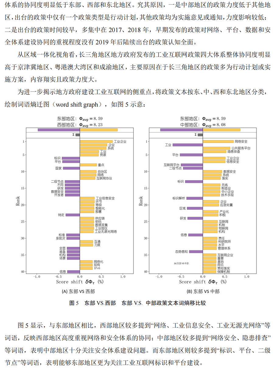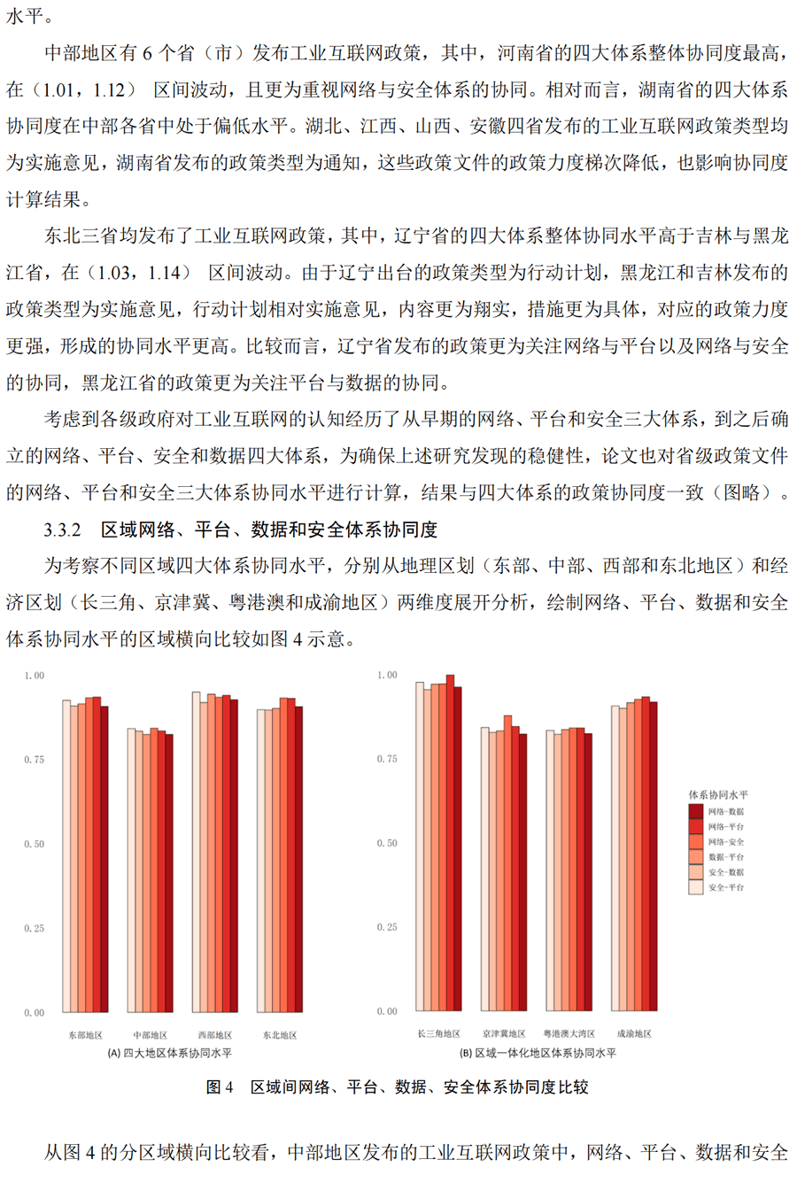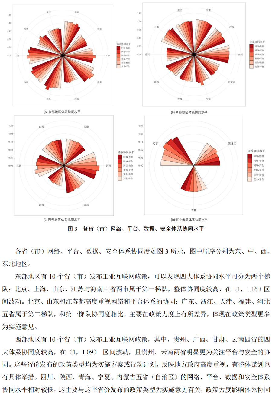 現(xiàn)有研究多圍繞工業(yè)互聯(lián)網(wǎng)架構(gòu)、標(biāo)準(zhǔn)和平臺(tái)體系展開,較少分析地方政府對(duì)四大功能體系 建設(shè)的政策導(dǎo)向。本文一方面應(yīng)用協(xié)同度算法評(píng)價(jià)地方政策體系協(xié)同水平,識(shí)別體系協(xié)同短板, 另一方面總結(jié)東、中、西和東北地區(qū)地方政策建設(shè)工業(yè)互聯(lián)網(wǎng)的側(cè)重點(diǎn)差異。